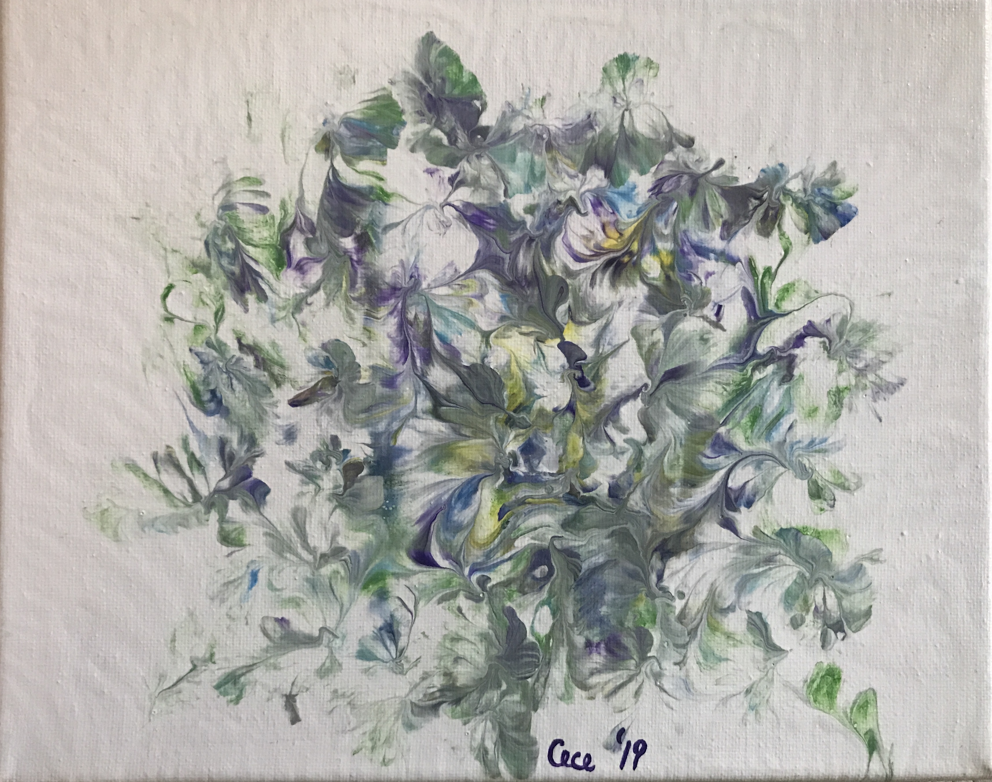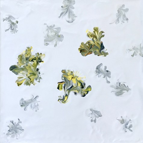 Fast forward to March 15, 2020, the day in which the US declared a state of emergency and the country went into lockdown due to the Covid 19 Pandemic. Only one day before, I had stood in my friend’s great room (my makeshift studio at the time), struggling to stretch seven cups of paint onto my largest canvas yet – 24″X24″! The finished piece now hangs in my small apartment, serving as a reminder of what I lost that day more than five years ago. Hard to believe how much has changed since I last handled a jug of Floetrol.