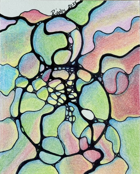 Recently, on the other side of so much change, my innate desire to create began to stir, and much like my experience with pouring paint, in late summer-early fall of 2024, I stumbled upon yet another captivating abstract art medium. Neurographica(R) is a drawing technique developed in 2014 by Russian architect and psychologist Pavel Piskarev. Its widespread use is most likely due to the extreme accessibility of the method (paint pouring requires gallons of paint, Floetrol & glue, lots of level space, and is by far the messiest, most time-consuming art form I have ever encountered!). In contrast, neurographic art demands little in the way of supplies, space, and needs zero inborn ‘talent’ for drawing – in other words, if you can manage to create a squiggly line and the bare resemblance of simple shapes, then you, too can create a beautiful expression of your deepest thoughts and emotions around any topic!